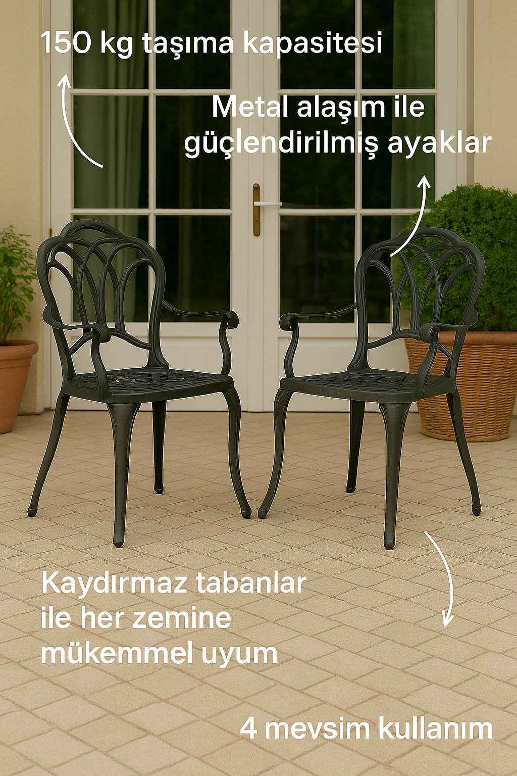 Masavera Bahçe Sandalyeleri, dış mekanlarda şıklık ve dayanıklılığı bir arada sunuyor. Zarif tasarımı, güçlü yapısı ve 150 kg taşıma kapasitesiyle dikkat çeker. Metal inserterler ile güçlendirilmiş ayakları ve kaydırmaz tabanları sayesinde her türlü zeminle uyum sağlar, güvenli ve konforlu bir kullanım sunar. Dört mevsim boyunca dayanıklı olan bu sandalyeler, bahçenizden terasınıza kadar her alanda mükemmel uyum sağlar. Estetik detayları ve fonksiyonel özellikleri ile dış mekanlarınızı güzelleştirin.